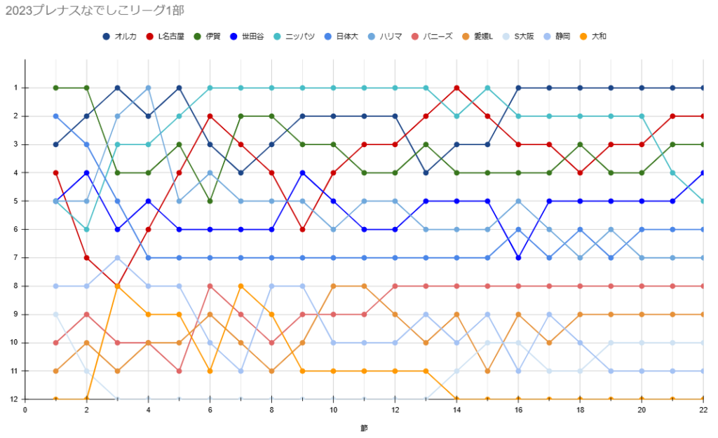 シーズンを通じてほとんどの時期にニッパツが4位以内にいて、世田谷はほとんど5位以下を推移して、最後に両者が入れ替わったのです。