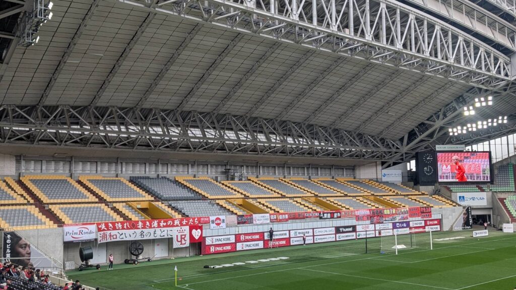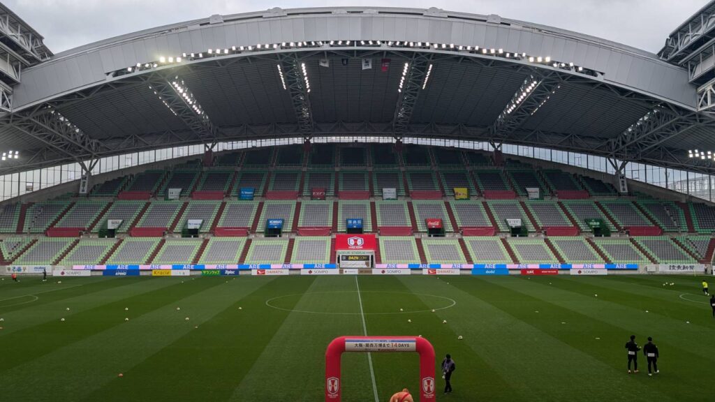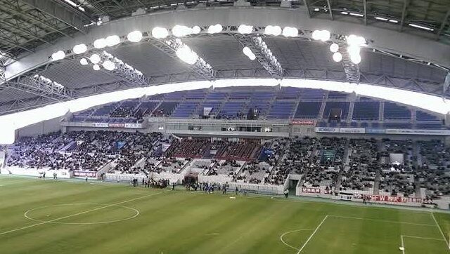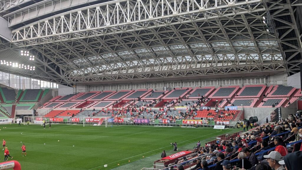 左側(北側・ビジター側)スタンドはこのような光景です。作中ではホームの鹿島サポーターがいっぱいになります。