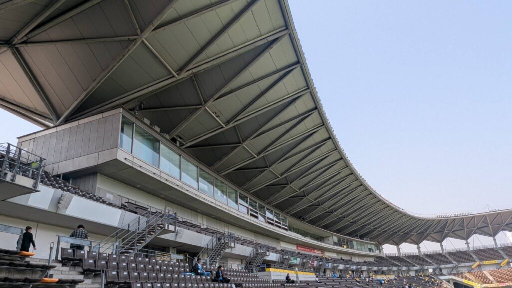 このスタジアムの最大の特徴は1階席から2階席に上がるための階段が、ピッチ側から向かって左下から右上への傾斜に統一されているところです。
